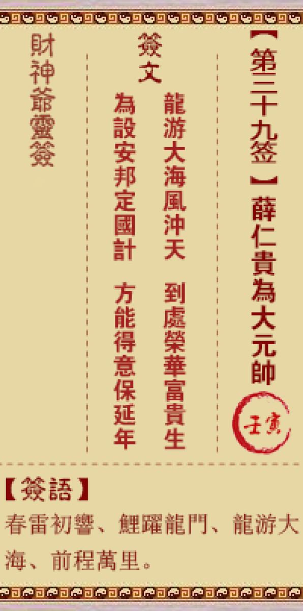 财神灵签第三十九签解签三九签、壬寅签、薛仁贵为大元帅鲤鱼暂守在池中、一 ...
