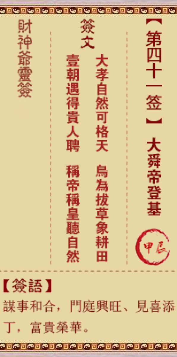 财神灵签第四十一签解签四一签、甲辰签、大舜帝登基金杯玉箸晋千般、大厦高 ...