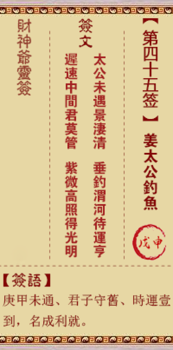 财神灵签第四十五签解签四五签、戊申签、姜太公钓鱼君今庚甲未亨通、且向江 ...