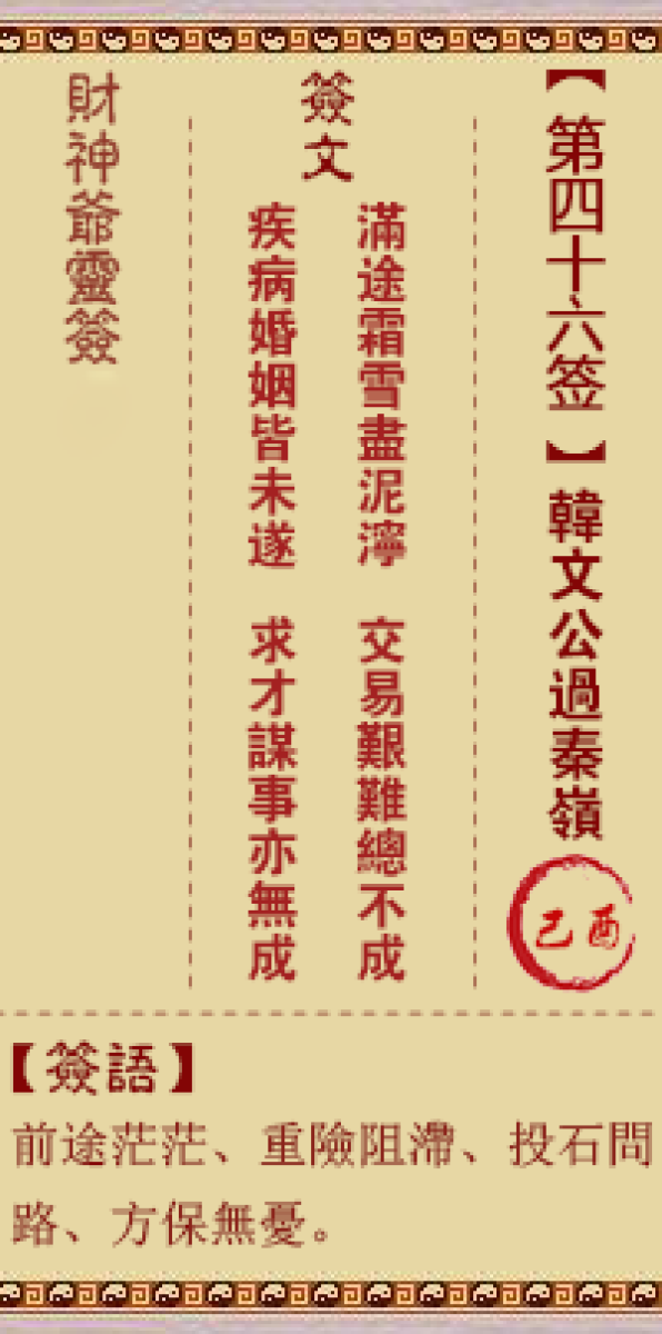 财神灵签第四十六签解签四六签、己酉签、韩文公过秦岭细雨霏霏落满天、茫茫 ...