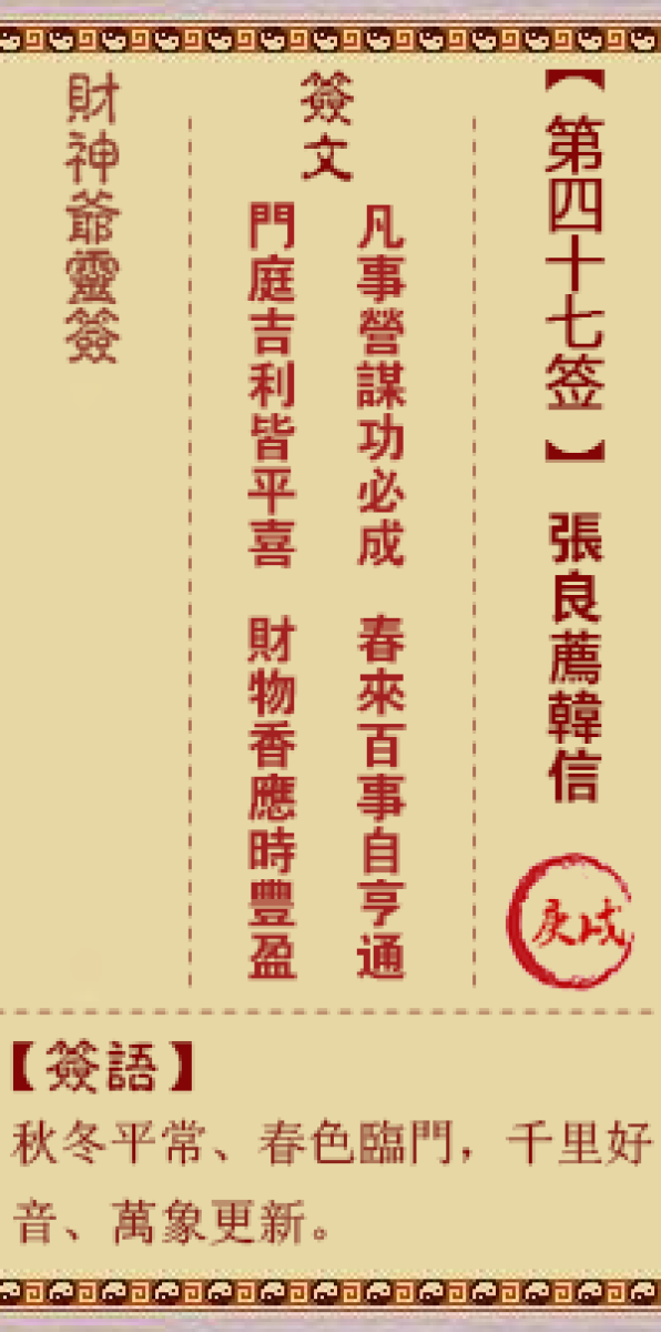 财神灵签第四十七签解签四七签、庚戌签、张良荐韩信秋冬作事只寻常、春色临 ...