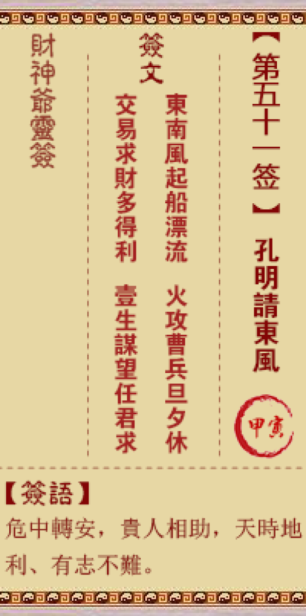 财神灵签第五十一签解签五一签、甲寅签、孔明请东风言激周郎成世冤、可怜彼 ...