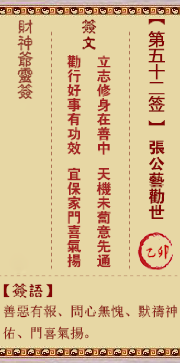 财神灵签第五十二签解签五二签、乙卯签、张公艺劝世作事问心莫念差、运逢牛 ...