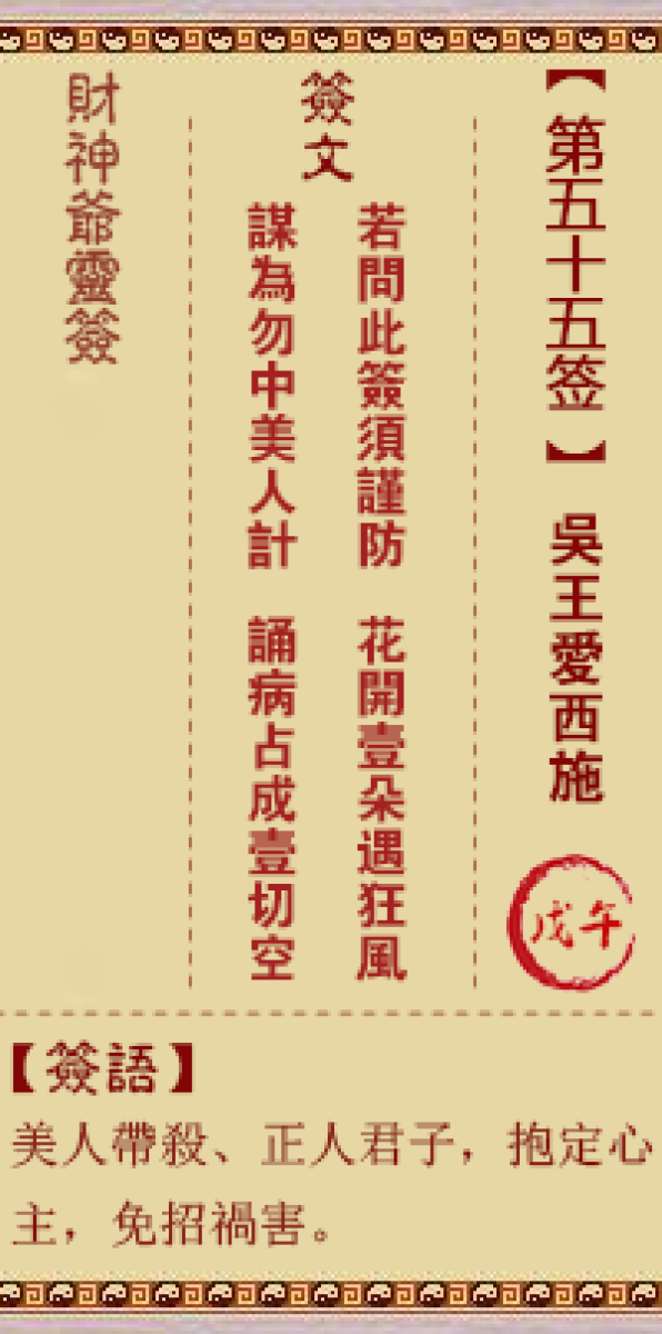 财神灵签第五十五签解签五五签、戊午签、吴王爱西施美人带杀暗知防、尔往西 ...