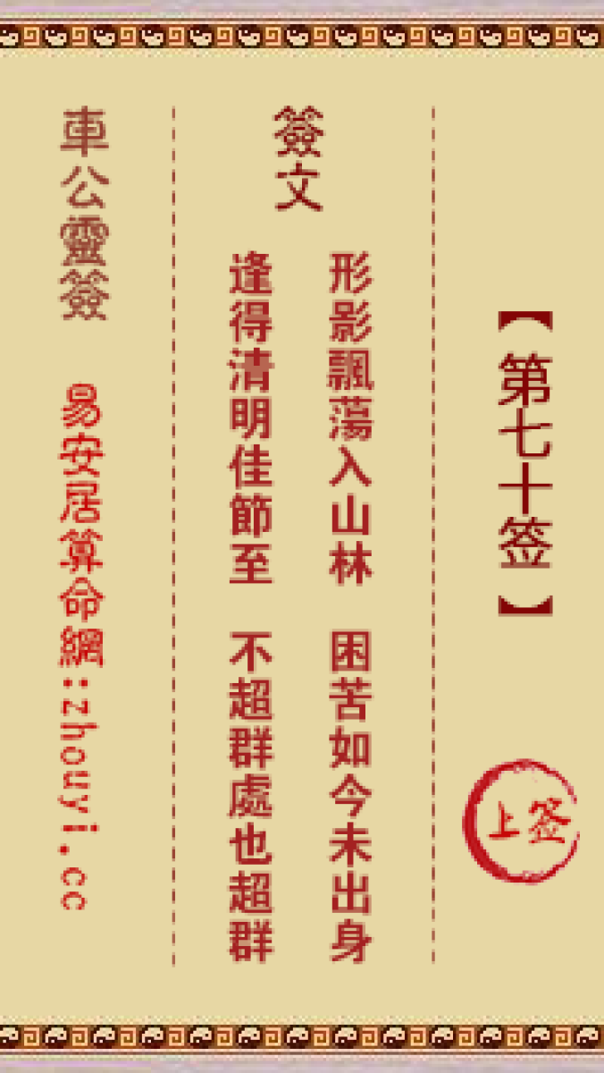 车公灵签第七十签解签车公灵签 第七十签:上签签文:形影飘荡入山林,困苦如 ...