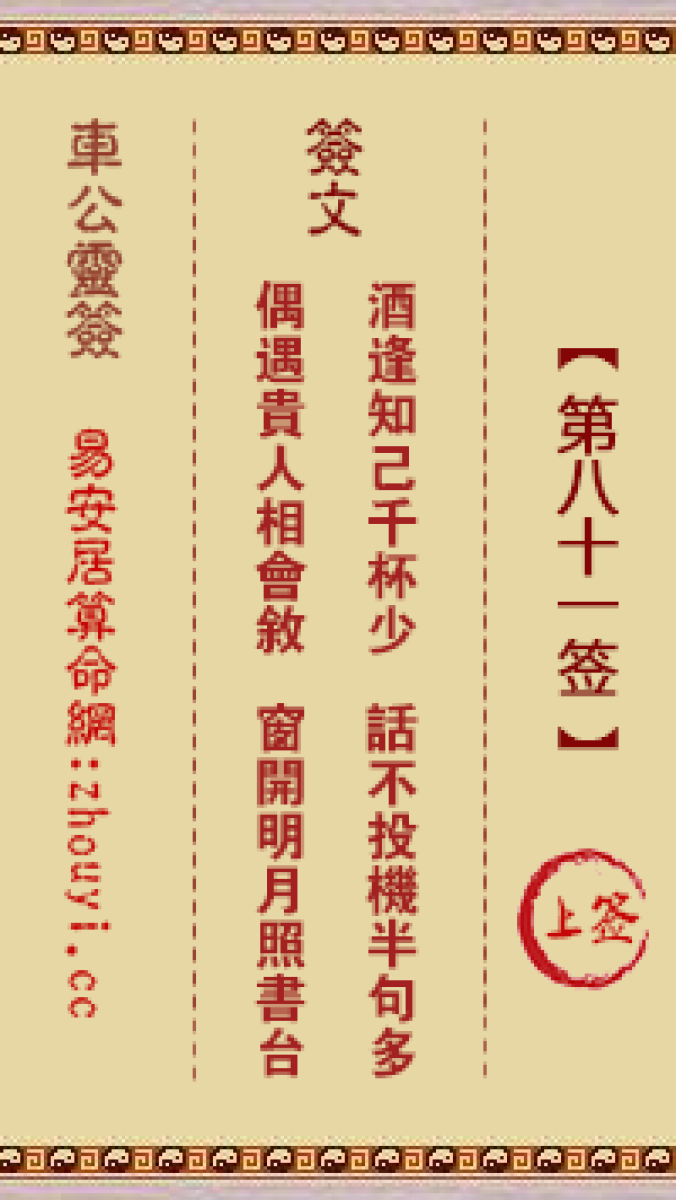 车公灵签第八十一签解签公灵签 第八十一签:上签签文:酒逢知己千杯少,话不 ...