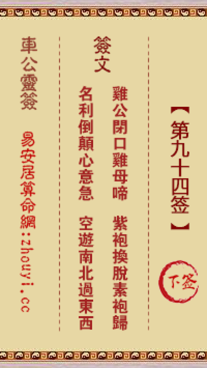 车公灵签第九十四签解签车公灵签 第九十四签:下签签文:鸡公闭口鸡母啼,紫 ...