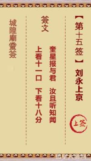 城隍庙灵签第十五签,刘永上京,城隍庙灵签第15签解签