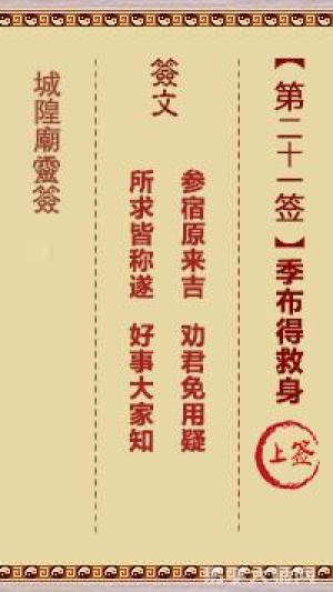 城隍庙灵签第二十一签,季布得救身安,城隍庙灵签第21签解签