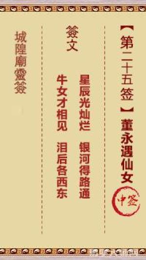 城隍庙灵签第二十五签,董永遇仙女,城隍庙灵签第25签解签