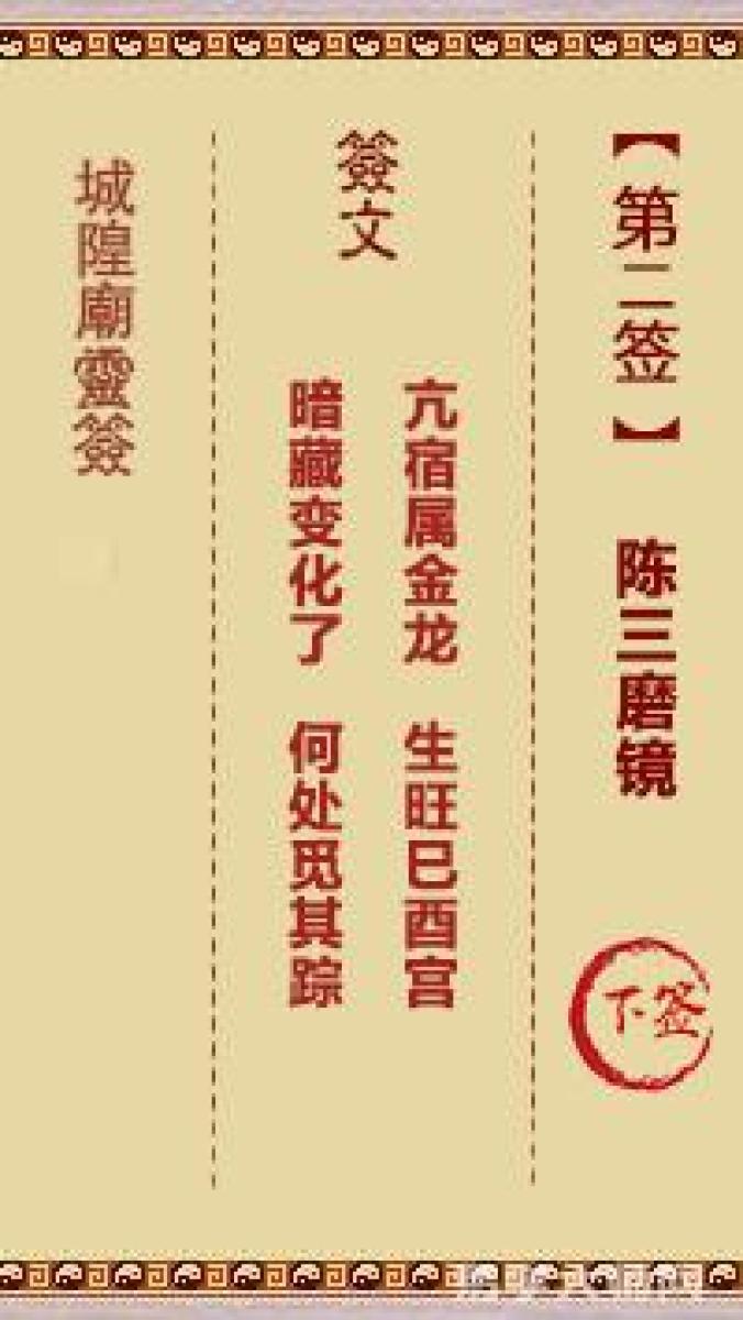 城隍庙灵签第二签解签城隍爷灵签 第二首 陈三磨镜 下签亢宿属金龙,生旺巳酉 ...