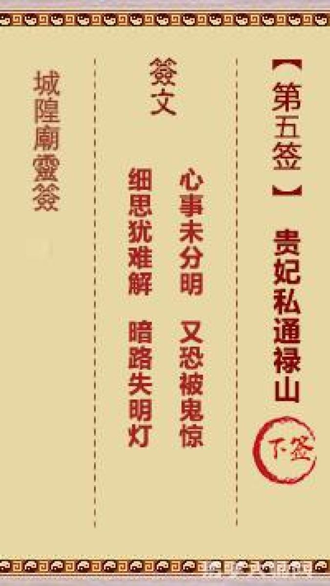 城隍庙灵签第五签解签城隍爷灵签 第五首 贵妃私通禄山 下签心事未分明,又恐 ...