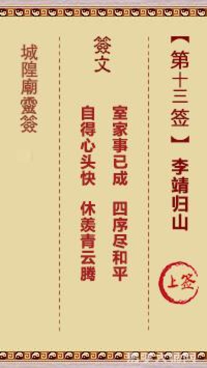 城隍庙灵签第十三签解签城隍爷灵签 第十三首 李靖归山 上签室家事已成,四序 ...
