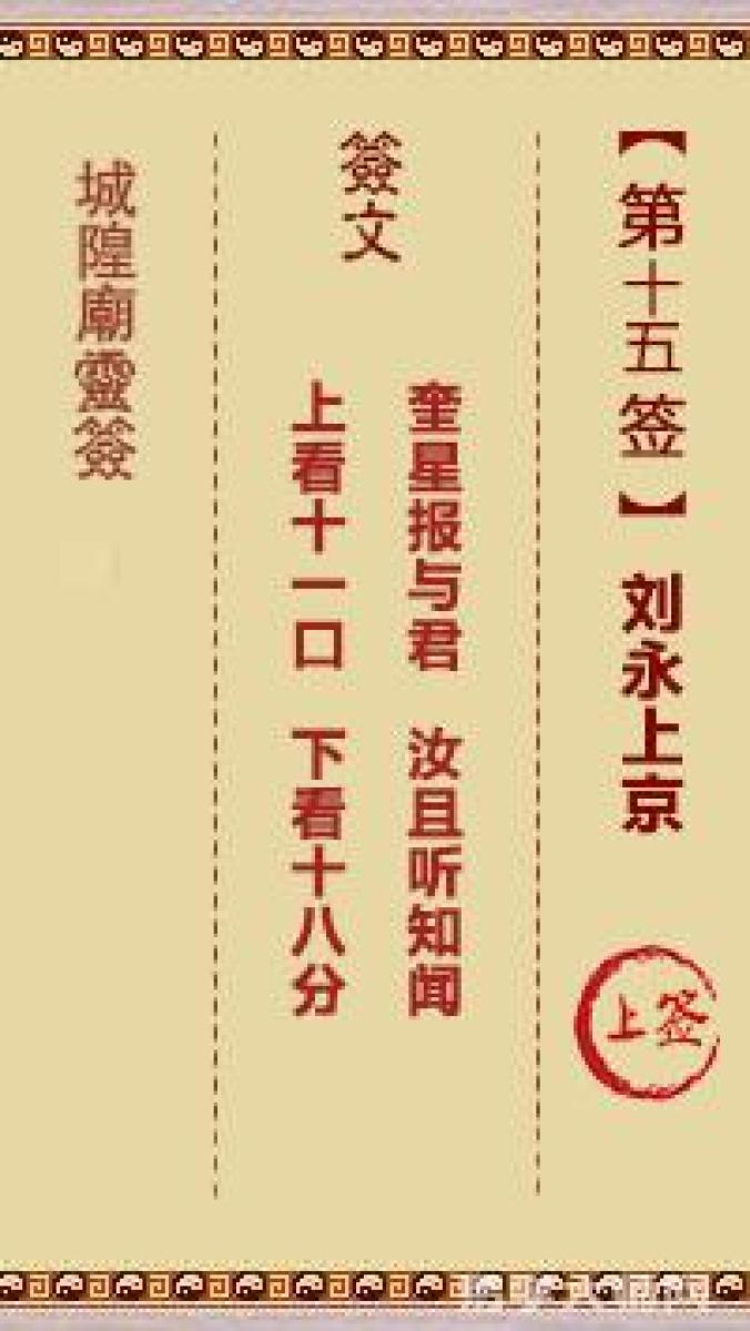 城隍庙灵签第十五签解签城隍爷灵签 第十五首 刘永上京 上签奎星报与君,汝且 ...