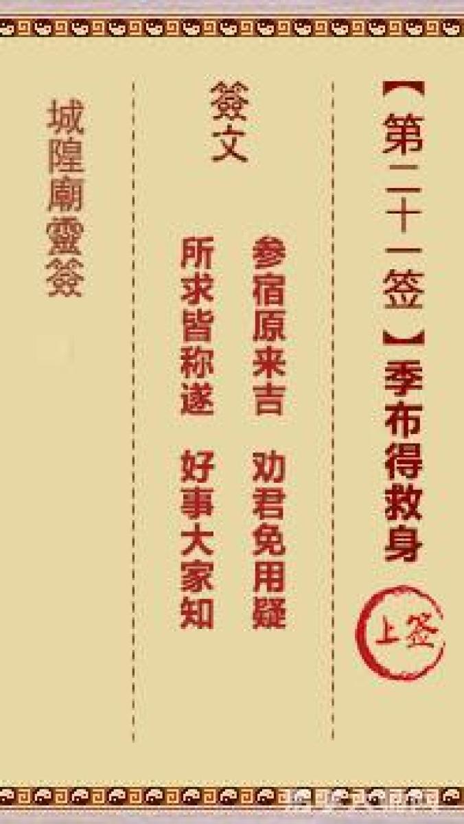 城隍庙灵签第二十一签解签城隍爷灵签 第廿一首 季布得救身安 上签参宿原来吉 ...