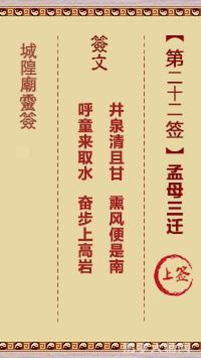 城隍庙灵签第二十二签解签城隍爷灵签 第廿二首 孟母三迁 上签井泉清且甘,熏 ...