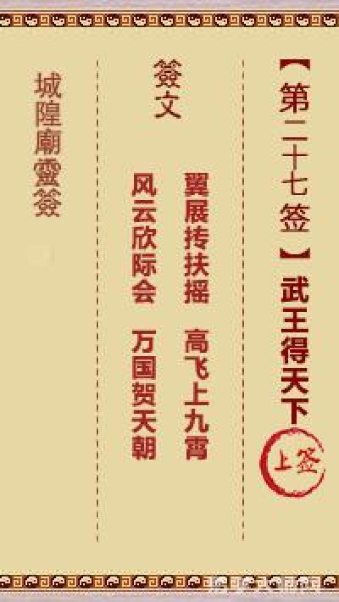 城隍庙灵签第二十七签解签城隍爷灵签 第廿七首 武王得天下 上签翼展抟扶摇, ...