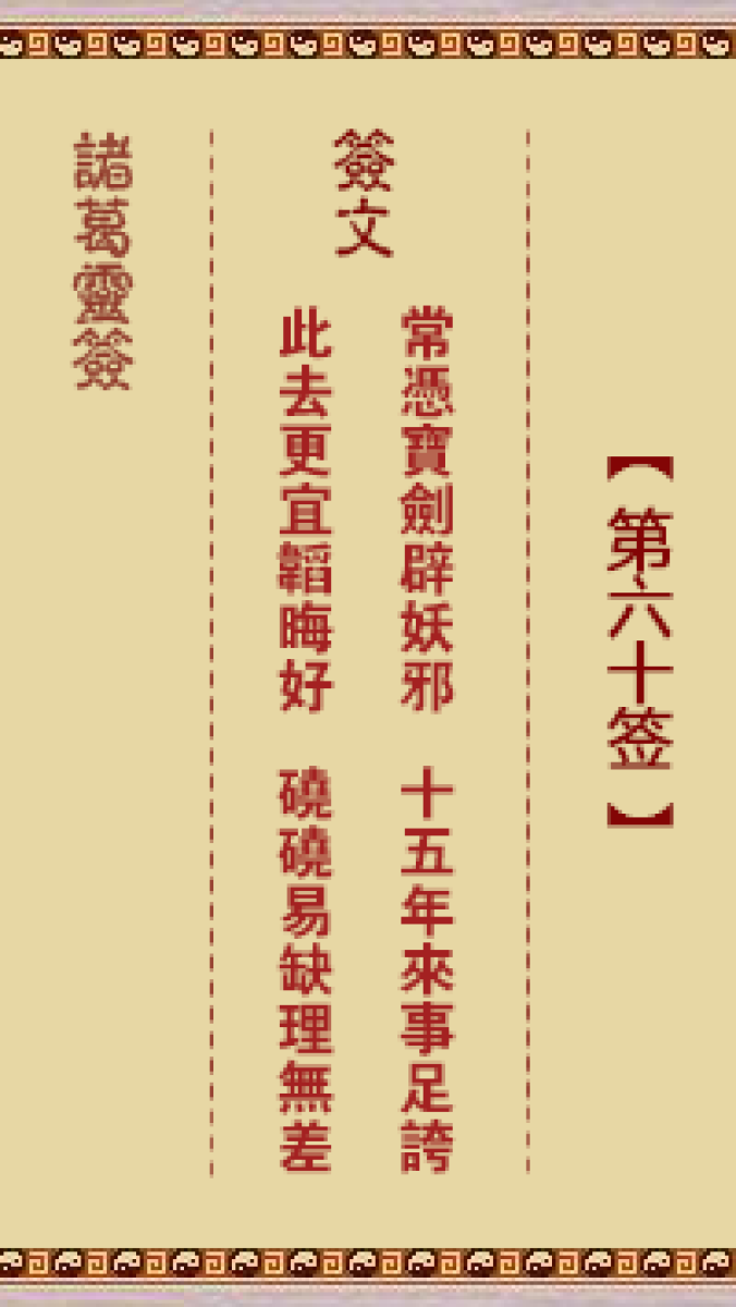 第六十首。常凭宝剑辟妖邪、十五年来事足夸、此去更宜韬晦好、硗硗易缺理无 ...