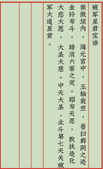 破军星君是天之上帝,又称瑶光星、天冲星,主天地机运,四时长短,否泰劫会。破军星君主金,披素霞之披,戴七宝星冠,破军即天之上宰,星光围绕九百里,光照万国。本站重点给大家讲解下道家宝诰破军星君宝诰,道家破军星君宝诰原文全经文介绍。破军星君宝诰志心皈命礼紫微垣内,海元宫中。