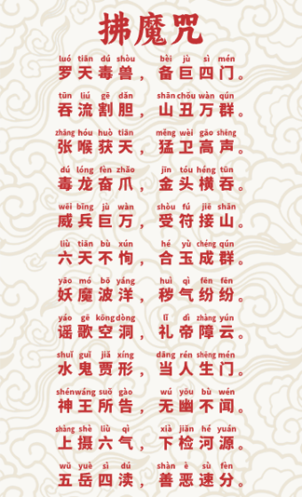 道教神咒符咒咒语拂魔咒是道教比较重要和有名的咒语。道教信众都知道教内传承有许多符咒咒语,在道藏经籍中被大量地保存,在斋醮科仪活动中被大量地使用,以表述道教的教义精神。道教的斋醮科仪是沟通人神的神圣程序或过程,是道教信仰的方式,而不是文娱表演的闹剧。