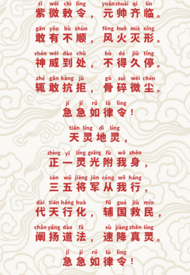 道教神咒符咒咒语灵官招役咒是道教比较重要和有名的咒语。灵官招役咒原文紫微敕令,元帅齐临。灵官招役咒解析灵官是主管人的身外事,专门守卫人体的身形、住的舍宇、治邑等。道教中的灵官很多,著名的如道教的护法神王灵官等。