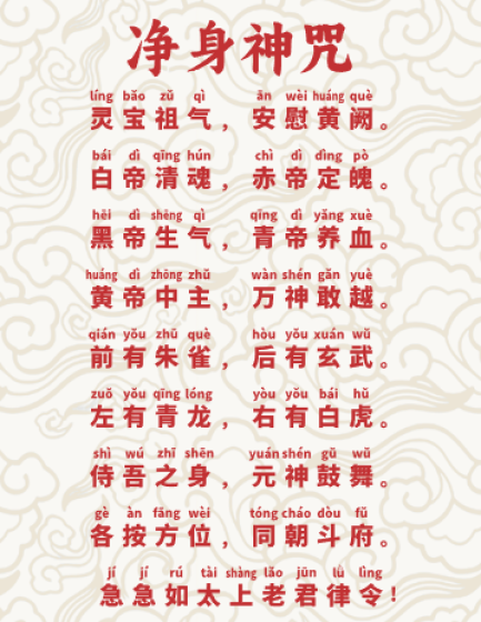 道教神咒符咒咒语净身神咒是道教比较重要和有名的咒语。道教信众都知道教内传承有许多符咒咒语,在道藏经籍中被大量地保存,在斋醮科仪活动中被大量地使用,以表述道教的教义精神。这是从道教神秘文化、信仰层面上讨论的课题。道教的斋醮科仪是沟通人神的神圣程序或过程,是道教信仰的方式,而不是文娱表演的闹剧。