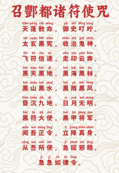 道教神咒符咒咒语召酆都诸符使咒是道教比较重要和有名的咒语。黑符大使,黑甲将军。召酆都诸符使咒解析本咒语以天蓬和御史为赐令者,要求酆都使者随队执行驱邪任务,并要求出征将领吏兵速备有效飞符,要不避艰难险阻,前往北方所求之处,听从吾的指令捉缚妖孽,不能懈怠拖延。