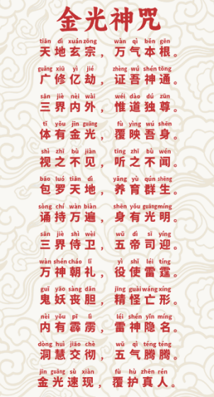 道教神咒符咒咒语金光神咒是道教比较重要和有名的咒语。金光神咒解析八大神咒,是道教入门的必修之学,应用极广。金光神咒以修炼道体之心性为主,主张以内炼金光元神护体,降魔卫道!所以为道门秘咒、神咒,其咒暗藏修炼之法。修道者既证金光,则鬼魅邪祟则丧胆而显露原形。