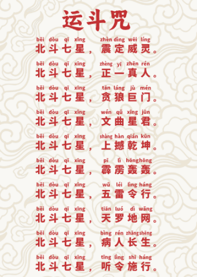 道教神咒符咒咒语 运斗咒是道教比较重要和有名的咒语。本站重点给大家讲解下道教神咒符咒咒语运斗咒介绍,道教神咒运斗咒咒语。北斗七星,病人长生。北斗七星,步斗天门。道教信众都知道教内传承有许多符咒咒语,在道藏经籍中被大量地保存,在斋醮科仪活动中被大量地使用,以表述道教的教义精神。