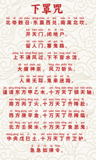道教神咒符咒咒语下罩咒是道教比较重要和有名的咒语。下罩咒解析罩,原指捕鱼或捕鸟的竹器,后引申为覆盖、罩住之意。道教信众都知道教内传承有许多符咒咒语,在道藏经籍中被大量地保存,在斋醮科仪活动中被大量地使用,以表述道教的教义精神。