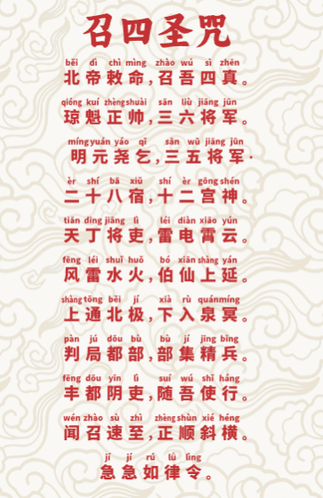 道教神咒符咒咒语召四圣咒是道教比较重要和有名的咒语。本站重点给大家讲解下道教神咒符咒咒语召四圣咒介绍,道教神咒召四圣咒咒语。道教的斋醮科仪是沟通人神的神圣程序或过程,是道教信仰的方式,而不是文娱表演的闹剧。