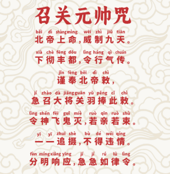 本站重点给大家讲解下道教神咒符咒咒语召关元帅咒介绍,道教神咒召关元帅咒咒语。召关元帅咒解析关元帅指关羽,为三国时期刘备属下的大将,是集忠、孝、节、义于一身的典型,本为星宿投胎,死后成神,道教称其为荡魔天君,伏魔大帝。