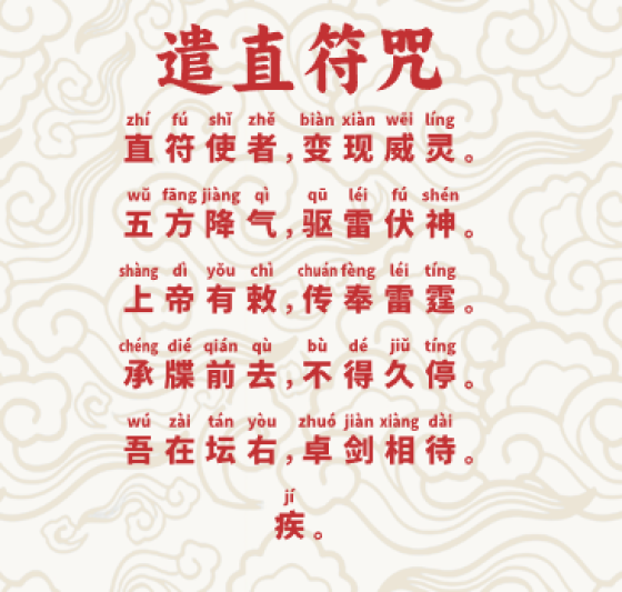 道教神咒符咒咒语遣直符咒是道教比较重要和有名的咒语。遣直符咒原文直符使者,变现威灵。道教信众都知道教内传承有许多符咒咒语,在道藏经籍中被大量地保存,在斋醮科仪活动中被大量地使用,以表述道教的教义精神。道教的斋醮科仪是沟通人神的神圣程序或过程,是道教信仰的方式,而不是文娱表演的闹剧。
