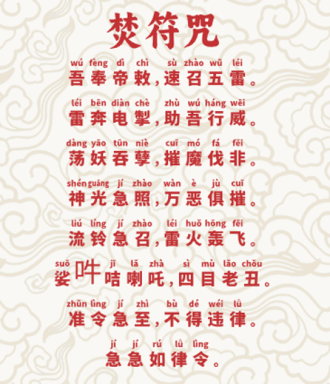 道教神咒符咒咒语焚符咒是道教比较重要和有名的咒语。焚符咒解析焚符咒就是焚烧符文时所念之咒。道教的符很多,各道派也不尽相同,其常常与咒一起使用。道教信众都知道教内传承有许多符咒咒语,在道藏经籍中被大量地保存,在斋醮科仪活动中被大量地使用,以表述道教的教义精神。