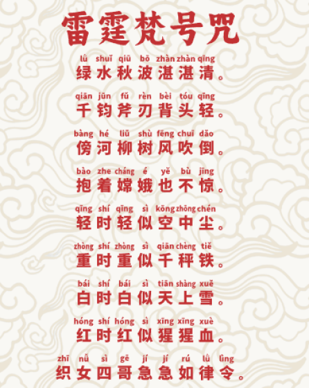 道教神咒符咒咒语雷霆梵号咒是道教比较重要和有名的咒语。雷霆梵号咒原文绿水秋波湛湛清。雷霆梵号咒解析“雷霆梵号”乃是由宇宙间金、木、水、火、土五行之气,通过天河星斗的运行所凝结而成的神圣号令。