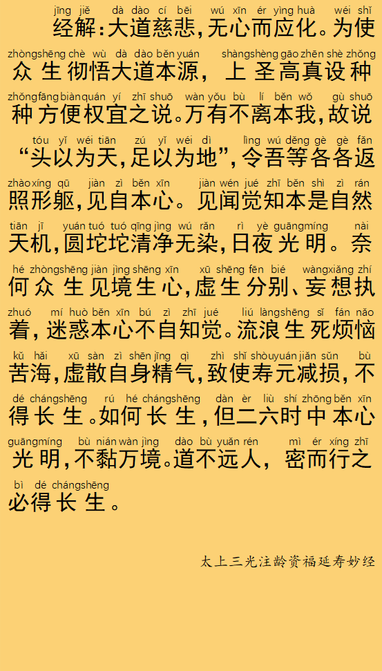 经解:大道慈悲,无心而应化。为使众生彻悟大道本源,上圣高真设种种方便权宜之说。万有不离本我,故说“头以为天,足以为地”,令吾等各各返照形躯,见自本心。见闻觉知本是自然天机,圆坨坨清净无染,日夜光明。奈何众生见境生心,虚生分别、妄想执着,迷惑本心不自知觉。流浪生死烦恼苦海,虚散自身精气,致使寿元减损,不得长生。如何长生,但二六时中本心光明,不黏万境。道不远人,密而行之必得长生。