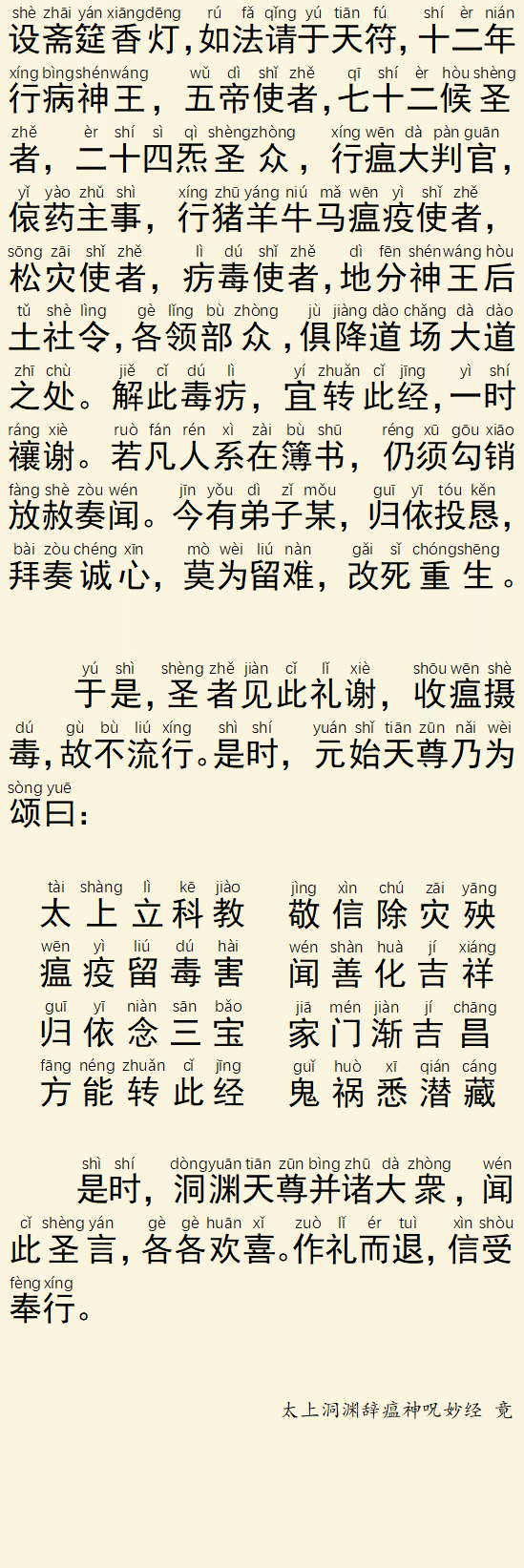 太上立科教,敬信除灾殃。瘟疫留毒害,闻善化吉祥。