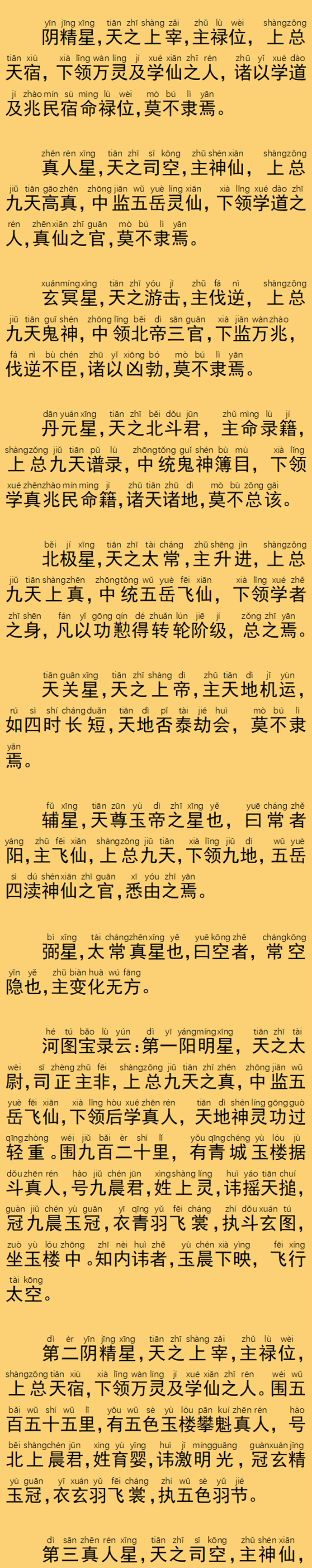 阳明星,天之太尉,司政主非,上总九天上真,中监五岳飞仙,下领后学真之人,天地神灵功过轻重,莫不隶焉。阴精星,天之上宰,主禄位,上总天宿,下领万灵及学仙之人,诸以学道及兆民宿命禄位,莫不隶焉。