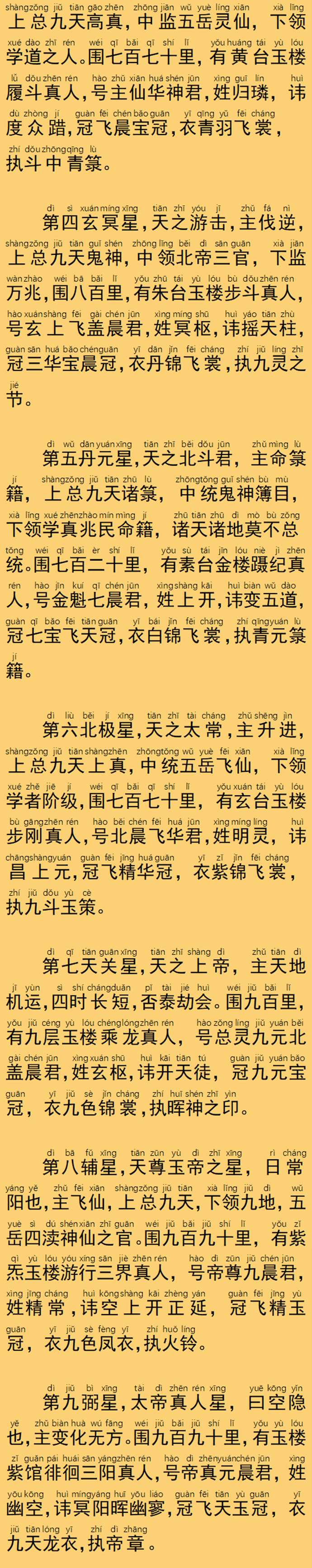 第三真人星,天之司空,主神仙,上总九天高真,中监五岳灵仙,下领学道之人。围七百七十里,有黄台玉楼履斗真人,号主仙华神君,姓归璘,讳度众踖,冠飞晨宝冠,衣青羽飞裳,执斗中青箓。