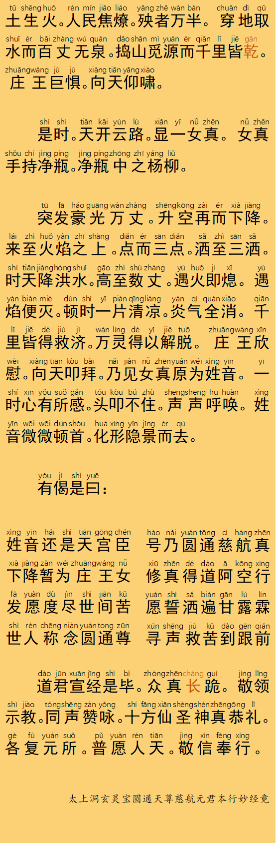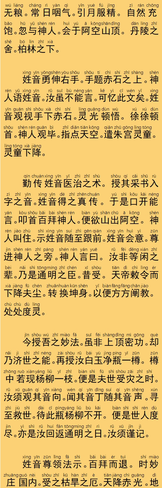 道君。微微顿首而曰。禅黎世界之中。妙庄国土之内。王号妙庄。庄王有女。讳字姓音。乃是通明殿中。玉驾前圣。奉令下生中土。生时有口不言。默默而过。年岁四春。庄王怒之。生汝何用。乃弃姓音于南浮桑。阿空山中。时经日长月久。云过雨休。姓音无粮。常日咽气。引月服精。自然充饱。忽与神人。会于阿空山顶。丹陵之舍。柏林之下。姓音勇伸右手。手题赤石之上。神人语姓音。汝虽不能言。可忆此文矣。姓音观视手下赤石。灵光顿悟。徐徐顿首。神人观毕。指点天空。遣朱宫灵童。灵童下降。勤传姓音医治之术。授其采书入字之音。姓音得之真传。于是口开能言。叩首百拜神人。便欲山出阿空。神人叫住。示姓音随至跟前。姓音会意。尊进神人之旁。神人言曰。汝非等闲之辈。乃是通明之臣。昔受。天帝敕令而下降夫尘。转换坤身。以便方方阐教。处处度灵。今授吾之妙法。虽非上顶密功。却乃济世之能。再授汝白玉净瓶一樽。樽中若现杨柳一枝。便是夫世受灾之时。汝须观其音向。闻其音祷。随其音声。寻至救世。待此瓶杨柳不开。便是世人度尽。亦是汝回返通明之日。汝须谨记。姓音尊领法示。百拜而退。