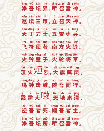 此咒的大意是:巡察法坛一周,立刻召请青龙、白虎、朱雀、玄武四灵。四灵已经召集,就让它们快速地来护卫法坛。捧着灵符,执着节杖,随我而行。扫除各种妖魔孽冤,驱逐各种邪精。清净法坛,听我的号令行动。巡坛二周,立刻召请风雷之神,他们能使沙飞石走,灌风施火的郎君也来帮助荡涤妖氛。遵守我的符命,随我而行。驱除邪氛,遣散对手,仔细视察法坛,连极小的东西也不能放过。清荡洁净法坛四周,根据需要任我召请雷神。巡坛三周,立刻召请天神天兵天将、五雷属下吏兵、飞符使者,南方流金火铃以及善用流金火铃的童子、使用风火转轮的将军。火光炽热,像流水一样四处飞散,猛烈地燃烧,大震我的威严。鸣钟击鼓,随我而行。雷声大作涵盖天地,天地之间一下子都清净安宁下来。违逆我命令的,我让他死亡,顺从我命令的,我让他生存。清洁我的法坛,让雷神听任到坛接受差役。