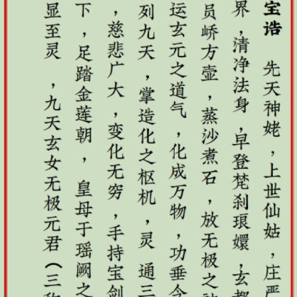 宝诰,是赞颂神仙的骈文,一种道家的特定文体。宝诰的平仄韵律十分严谨,以歌咏形式赞美叙述道家神仙们修行以及功德显化的典故。