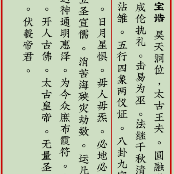 宝诰可以清诵、可以讽唱,可视为道家的“赞美诗”、“赞歌”。宝诰首句,皆以“志(至)心皈命礼”为开头,表示虔诚;后一句多为神仙被封为的名号。