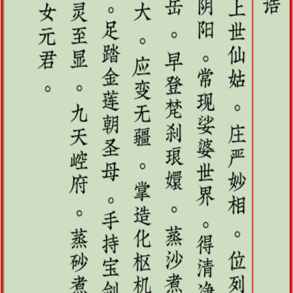 玄女娘娘“恭行天律,部领雷兵。如有下界精邪,北阴午酉,出没岩穴,蟠踞山林,窥阚家庭,损伤人命,神威所到,一切扫除,福佑生人,肃清魔魅。”