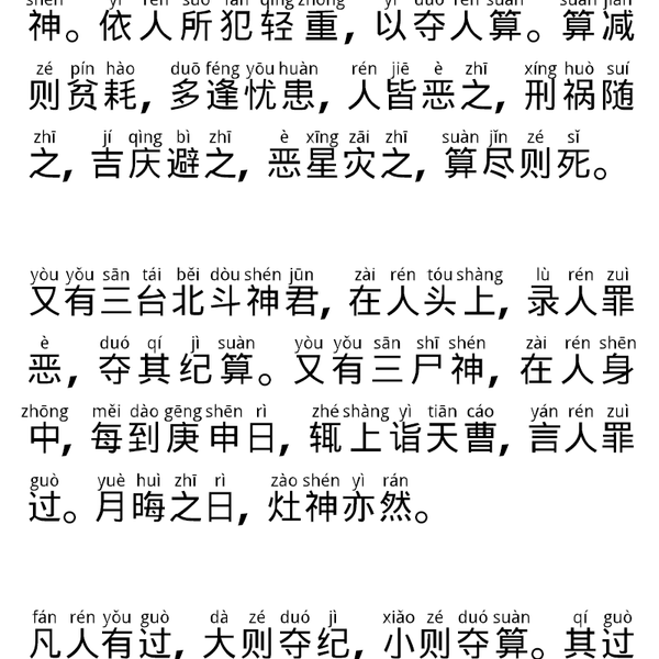老君重告天师曰:世人罪福善恶,皆属天司,忏罪消灾,莫越修奉。遇本命生辰,告身中元辰驿马,削落三灾九厄,保见今眷属安宁。凡有上士,於本命生辰持此真文者,外伏魔精,内安真性,功沾水陆,善及存亡,悔过虔恭,渐登妙果,重立玄功,证虚无道,乃得圣智圆通,隐显莫测,出有入无,逍遥云际,升入金门,与圣合真,身超三界,永不轮转,寿量无穷,快乐自在。凡有男女,於本命生辰及诸斋日,清浄身心,焚香持此真文,自认北极本命所属星君,随心祷祝,善无不应,灾罪消除,致感万圣千真俱来卫护。此文所在之处,千真敬礼,万圣护持,魔鬼潜消,精灵伏匿,世有灾殃,悉皆消灭。是名,北斗本命延生经诀,乃修真之迳路。得道逍遥,皆因此经,证圣成真,皆因此经,出离生死,皆因此经,保护男女,皆因此经,保命延年,皆得自在。永为身宝,福寿可称,保而敬之,非人勿示。