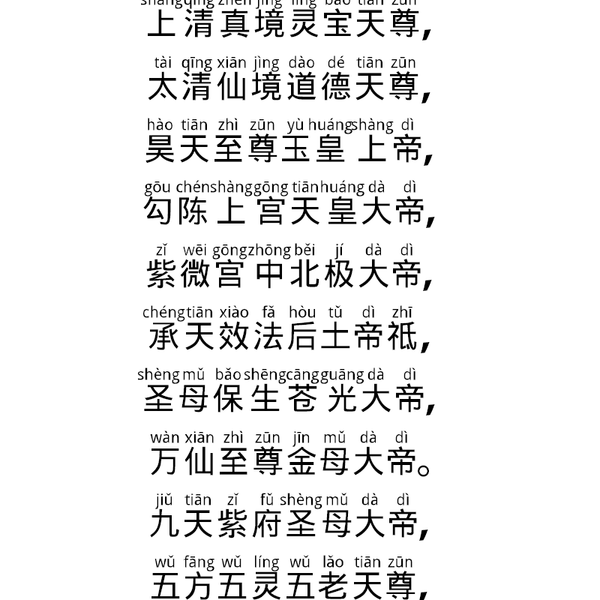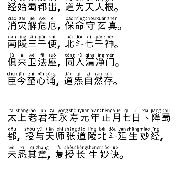 于是七元君,大圣善通灵,济渡诸厄难,超出苦众生,若有急告者,持诵保安平,尽凭生百福,咸契于五行,三魂得安健,邪魅不能停,五方降真气,万福自来骈,长生超八难,皆由奉七星,生生身自在,世世保神清,善似光中影,应如谷里声,三元神共护,万圣眼同明,无灾亦无障,永保道心宁。