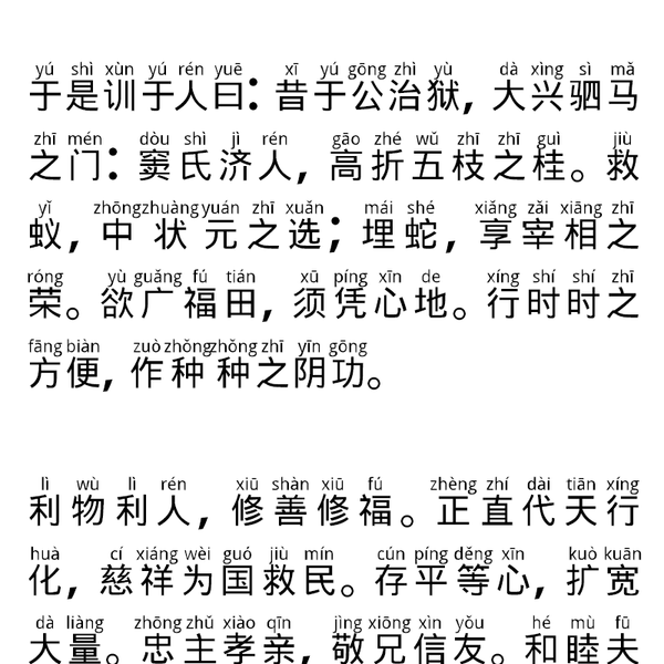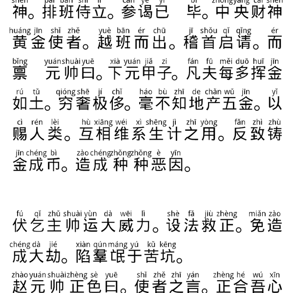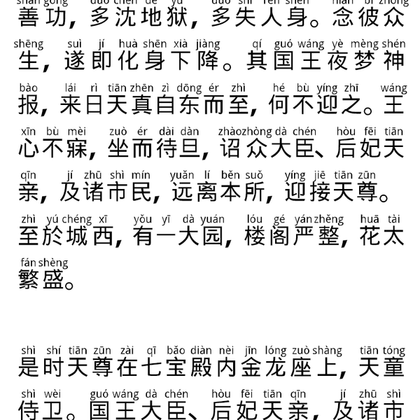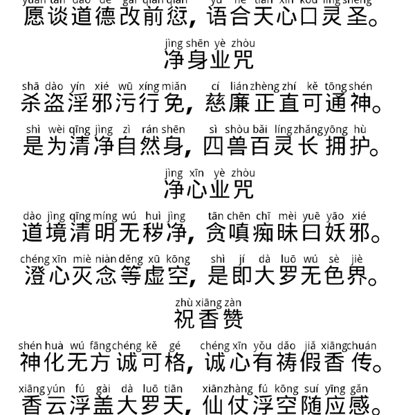 天尊言:吾(读:天尊)今所说,即是玉枢宝经。若未来世,有诸众生,得闻吾名,但冥心默想,作是念言,九天应元雷声普化天尊,或一声,或五七声,或千百声,吾即化形十方,运心三界,使称名者,咸得如意。十方三界,诸天诸地,日月星辰,山河草木,飞走蠢动,若有知若无知,天龙鬼神,闻诸众生一称吾名,如有不顺者,馘(guó)首刳(kū)心,化为微尘。