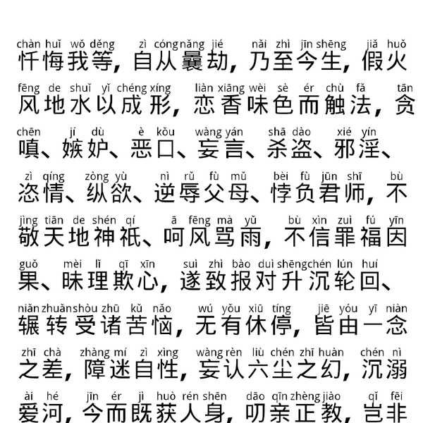 天尊言:沉痾伏枕,痼疾压身,积时弗瘳,求医罔效,五神无主,四大不收。或是五帝三官之前,泰山五道之前,日月星辰之前,山林草木之前,灵坛古迹之前,城隍社庙之前,里巷井灶之前,寺观塔楼之前,或地府三十六狱,冥官七十二司,有诸冤枉,致此牵缠,或盟诅咒誓之所招,或债垛负偿之所致。三世结衅,累劫兴仇,埒其咎尤,厍其执对,皆当首谢,即诵此经。